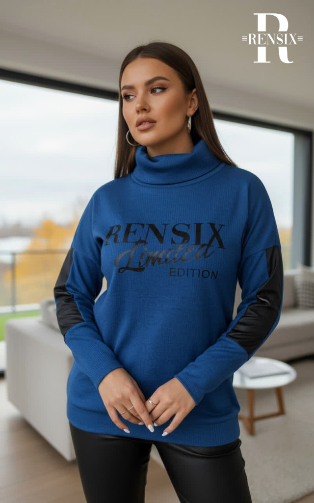 Bordázott, kötött anyagból készült, garbós nyakú, műbőr betétes pulcsi tunika.