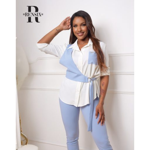 Enyhén elasztikus anyagból készült díszmellényes elől rövidebb, hátul picit hosszabb, zsebes, végig gombos, galléros nyakú ing.