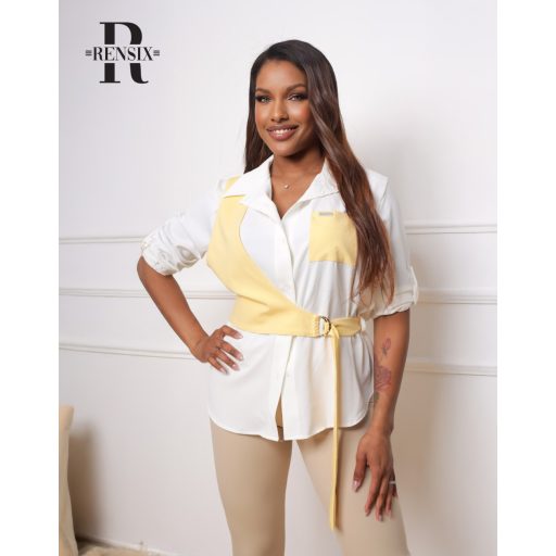 Enyhén elasztikus anyagból készült díszmellényes elől rövidebb, hátul picit hosszabb, zsebes, végig gombos, galléros nyakú ing.