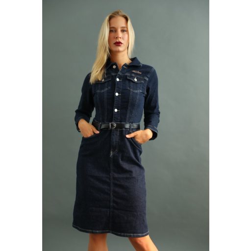 Galléros nyakú, derékig gombos, öves farmer ruha. (az öv tartozéka a ruhának)