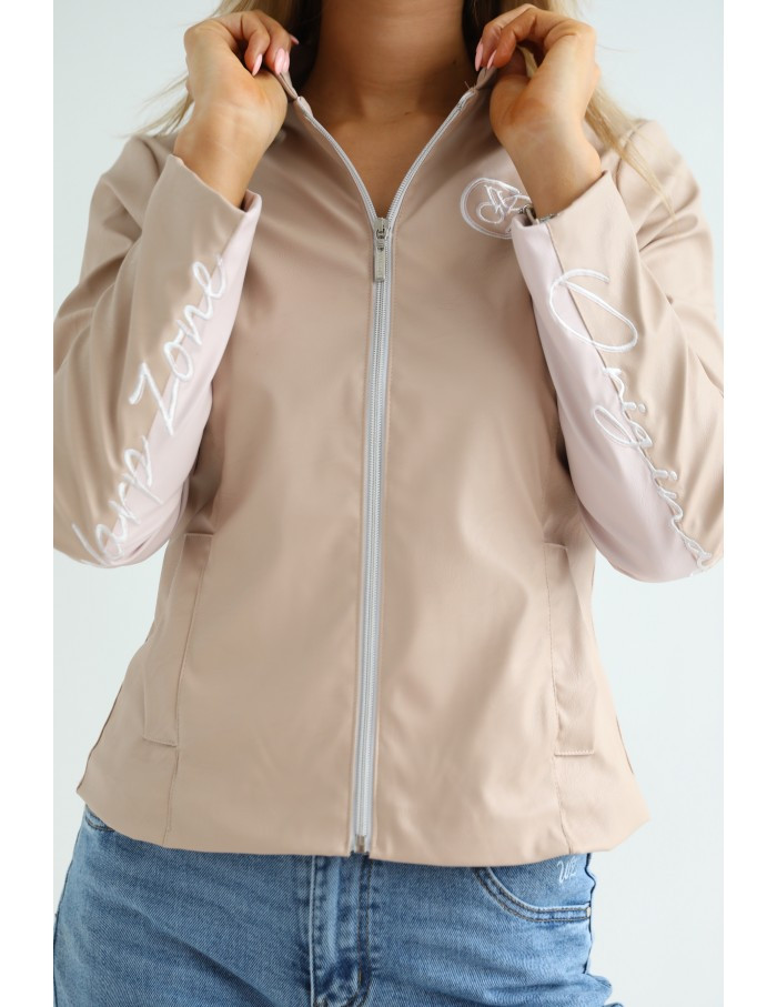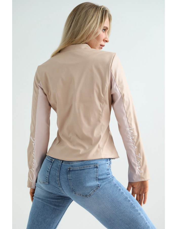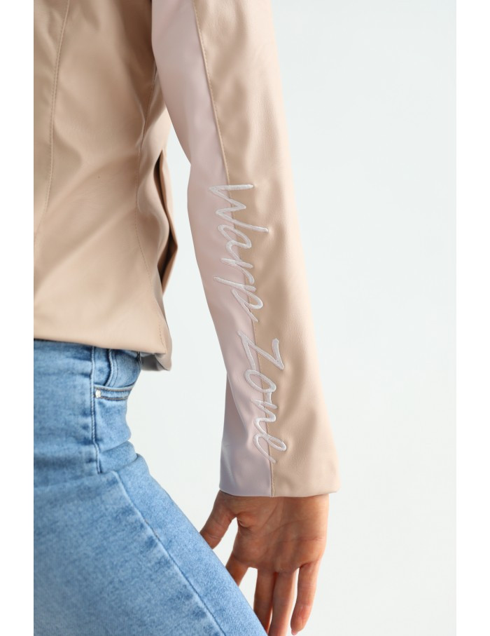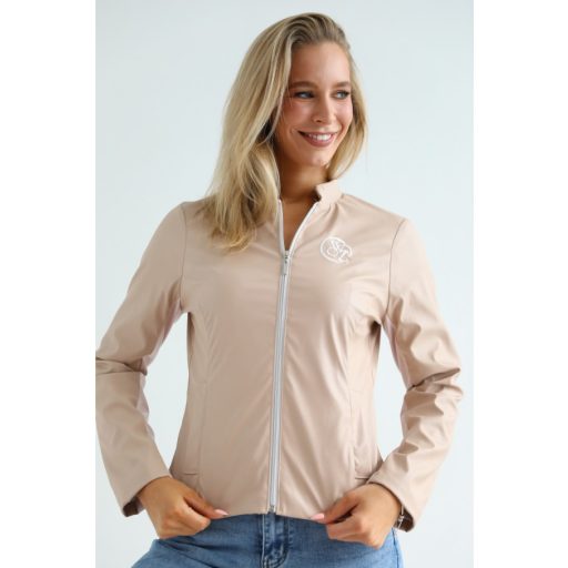 Műbőr anyagból készült mokka színű, karok alsó részén púder betétes, bélelt kabát.