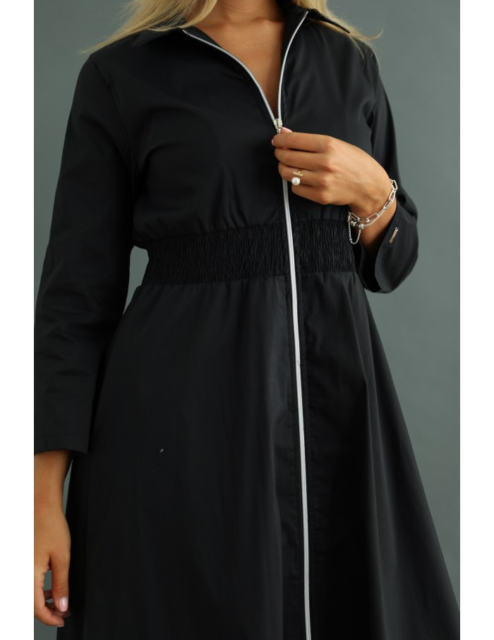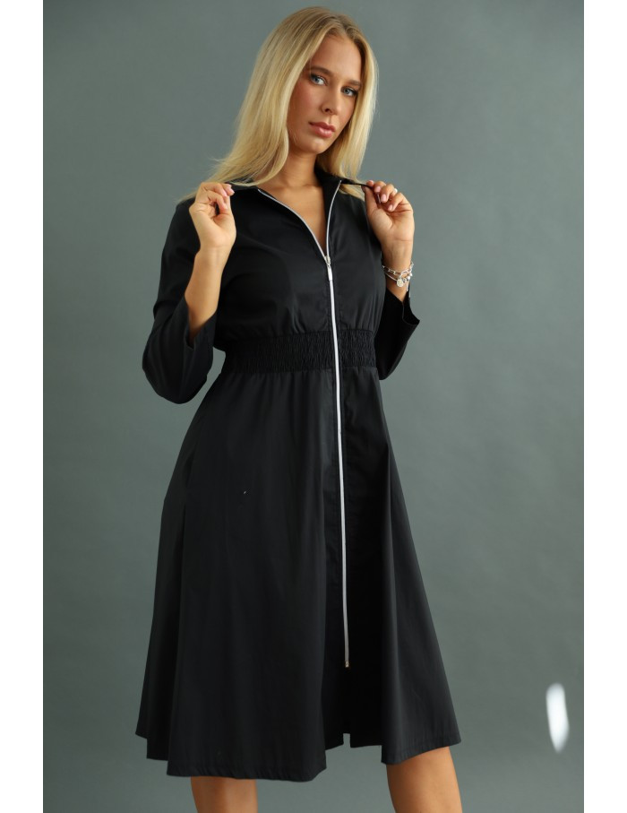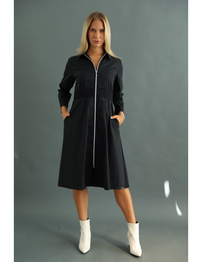 Elől végig zippes, gumis derekú, oldalán zsebes ingruha.