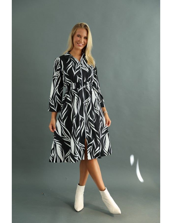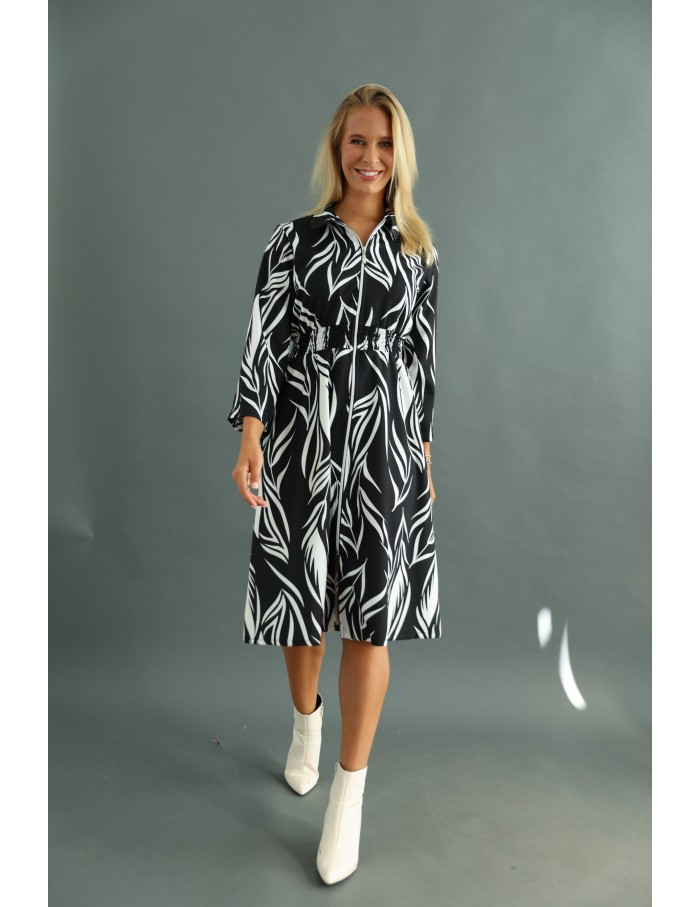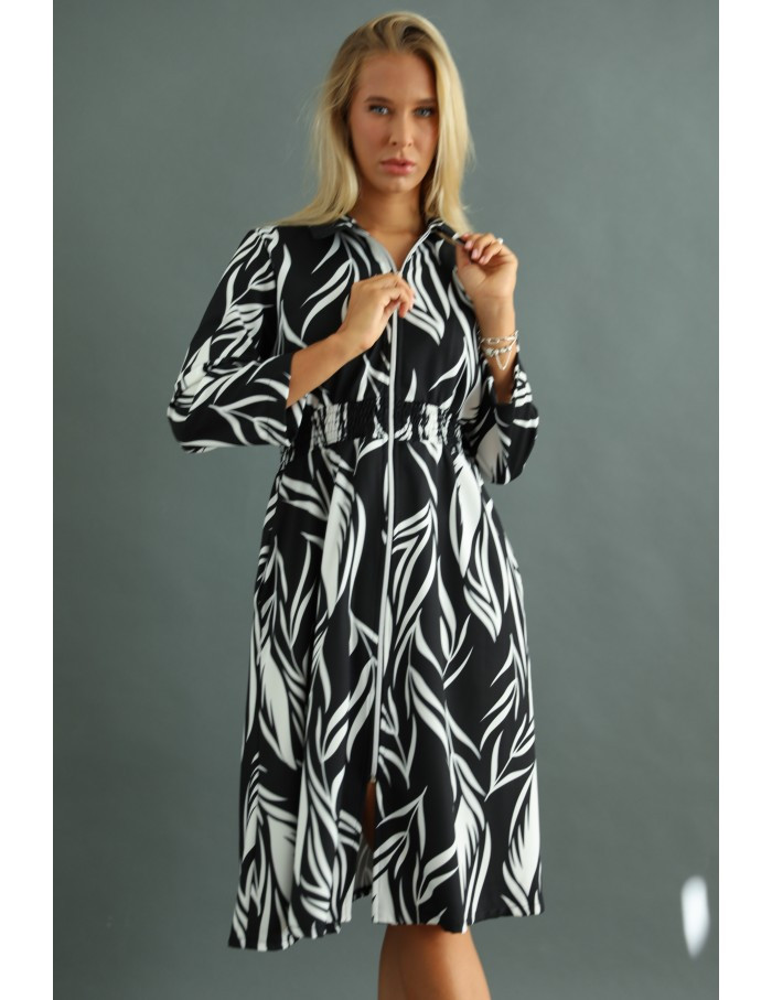 Elől végig zippes, gumis derekú, oldalán zsebes ingruha.
