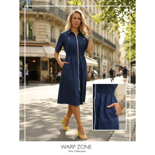 Elől végig zippes, gumis derekú, oldalán zsebes ingruha.